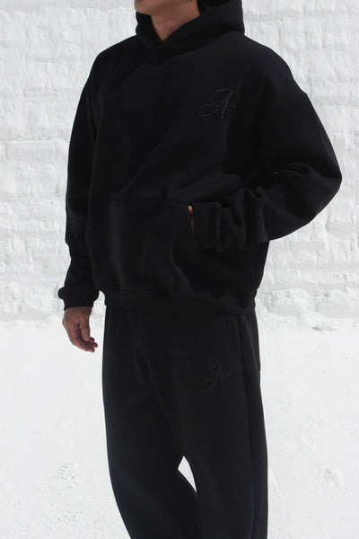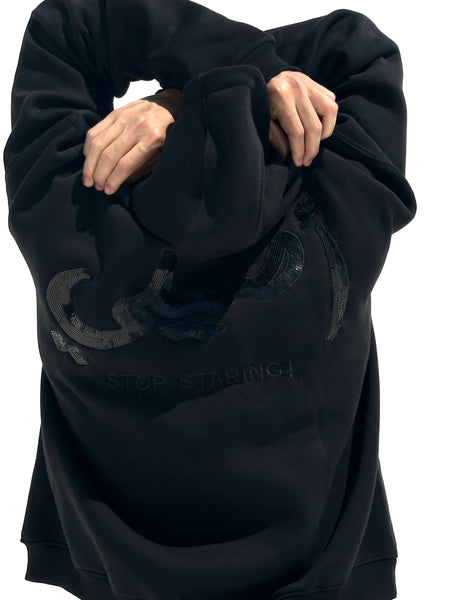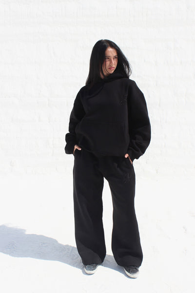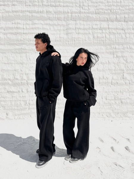 The ASILI BLING BLING SET is a black-on-black statement set. This unisex oversized hoodie and wide-leg sweatpants set features the bilingual Asili logo up front on both pieces. The back delivers a bold twist — a glossy bling-bling manipulation of the word "أصيلي" paired with the bold statement “STOP STARING!” ,designed to stand out without trying.