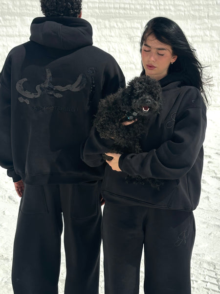 The ASILI BLING BLING hoodie is a unisex oversized hoodie featuring the bilingual Asili logo on the front left side. The back delivers a bold twist — a glossy bling-bling manipulation of the word "أصيلي" paired with the bold statement “STOP STARING!” ,designed to stand out without trying.